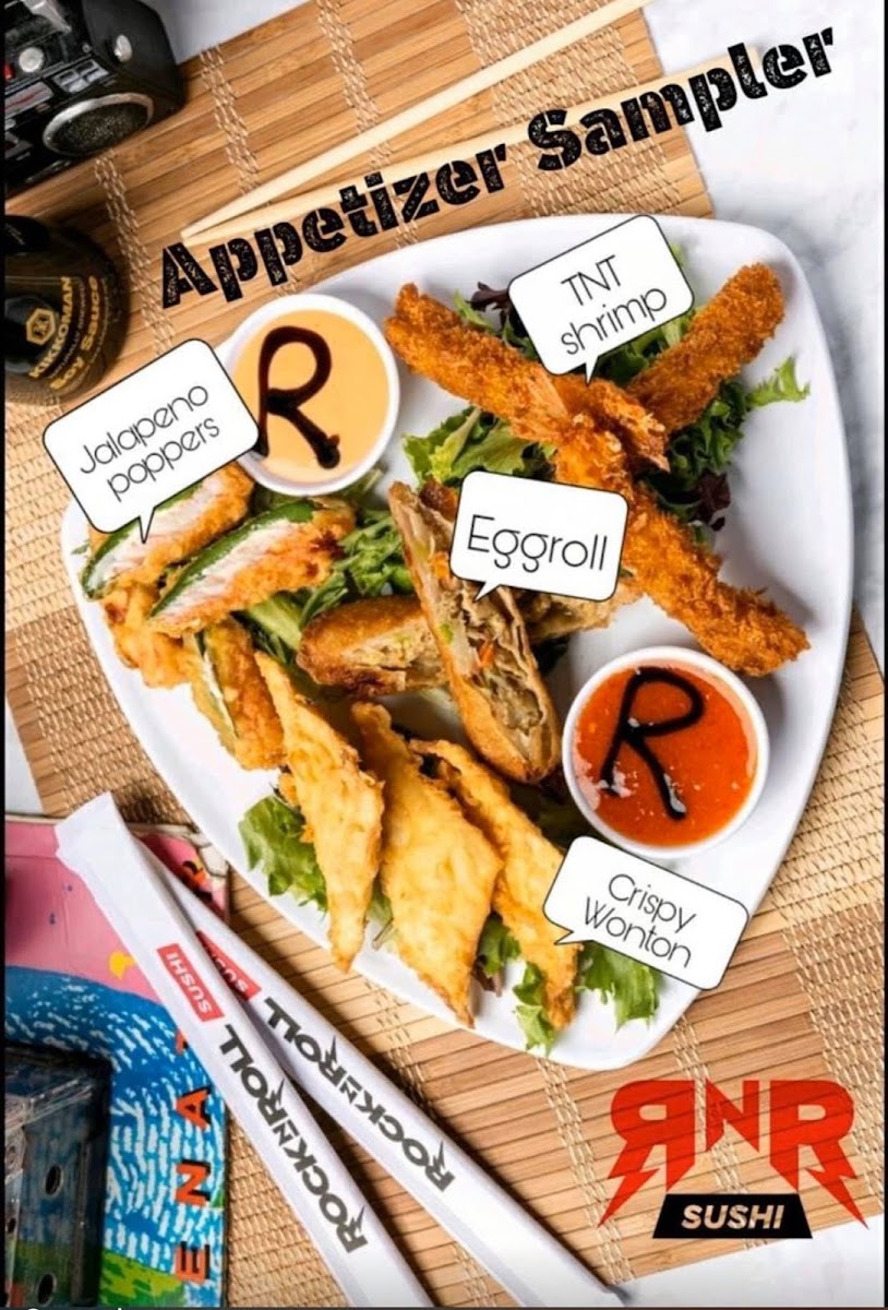 Crispy wontons, jalapeno poppers, eggroll and potstickes served with headbanger and sweet chili dip, both swirled with eel sauce.