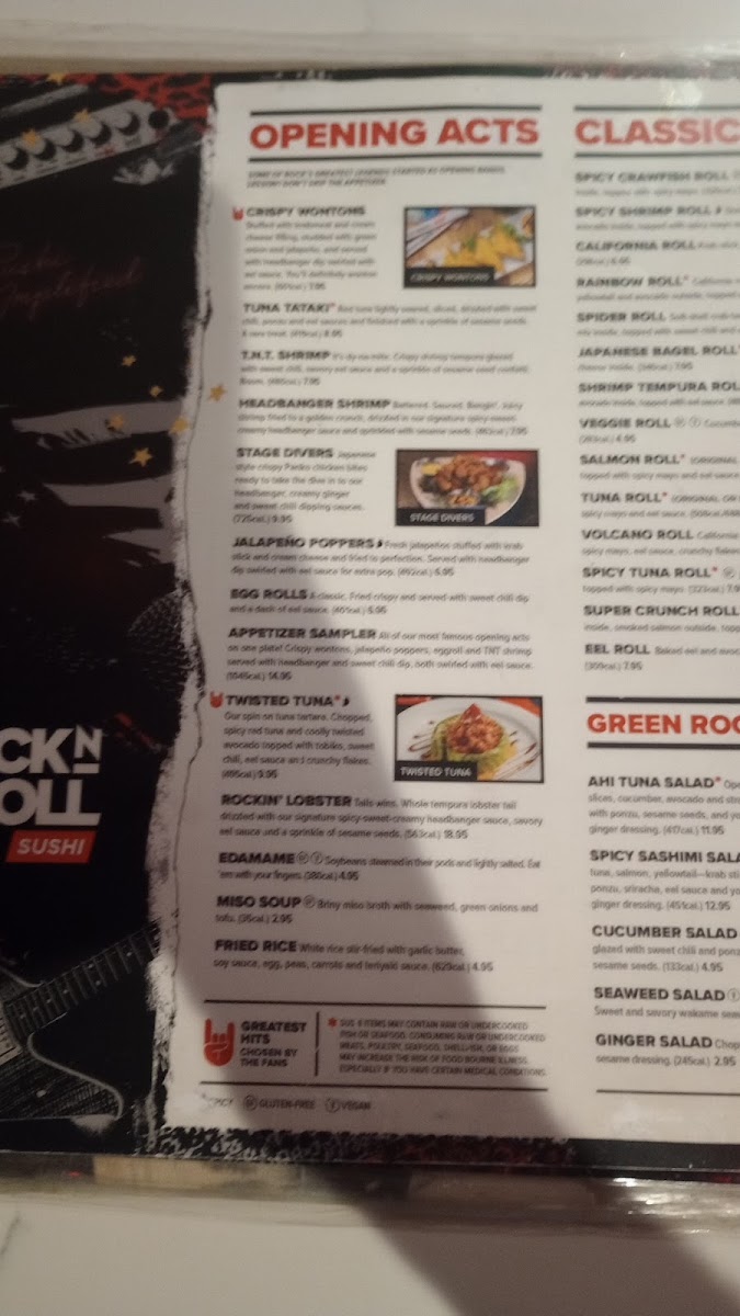Punk Rock Roll, Rocked Lobster Roll, Crowd Surfer Roll, Spicy Tuna Roll, Rainbow Roll, Tuna Roll